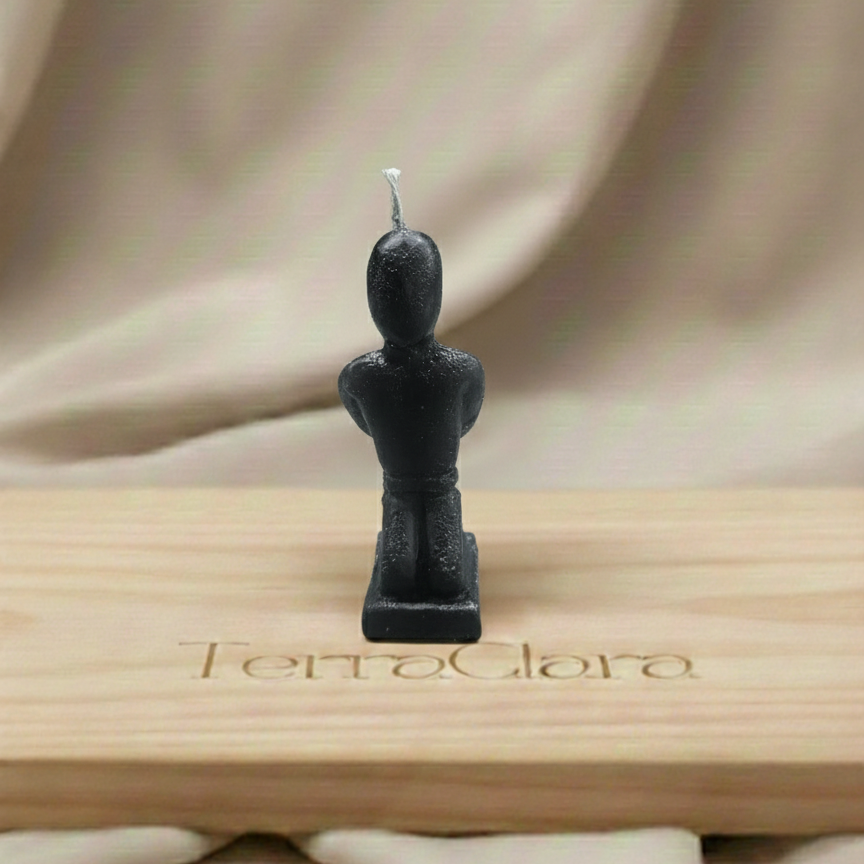 DESCRIPCIÓN: Esta vela ritual en forma de figura arrodillada, de color negro, ha sido creada para trabajar el reequilibrio de dinámicas de poder, la recuperación del control personal y la afirmación de límites energéticos, especialmente en vínculos donde se ha perdido la armonía o el respeto.